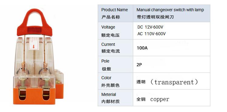 Manual changeover knife switch with lamp 2P 100A transparent color