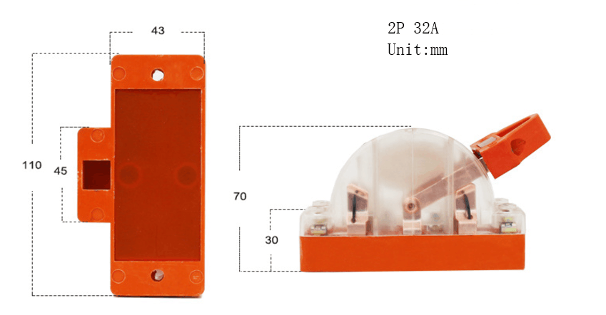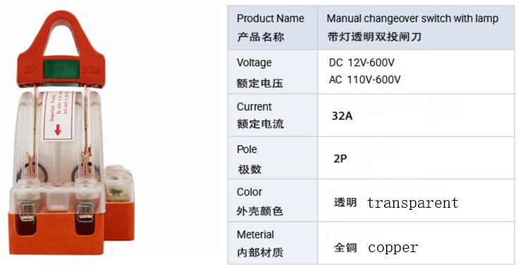 Manual changeover knife switch with lamp 2P 32A transparent color