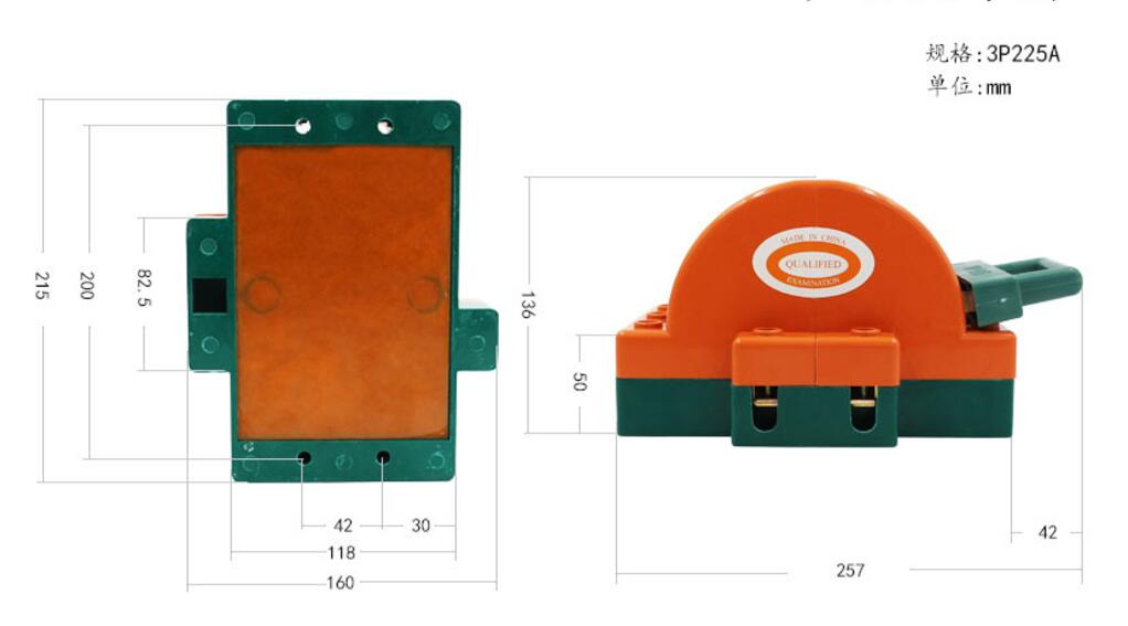 Copper knife knife switch 3P 225A bidirectional double throw switch isolating switch knife switch 1) Size of 3P 225A knife switch