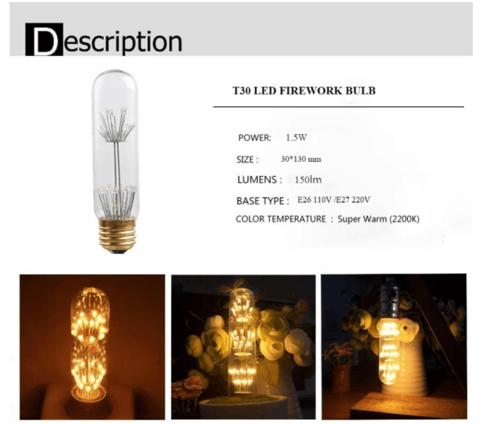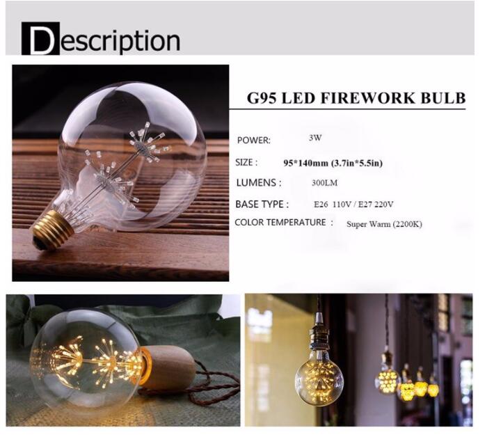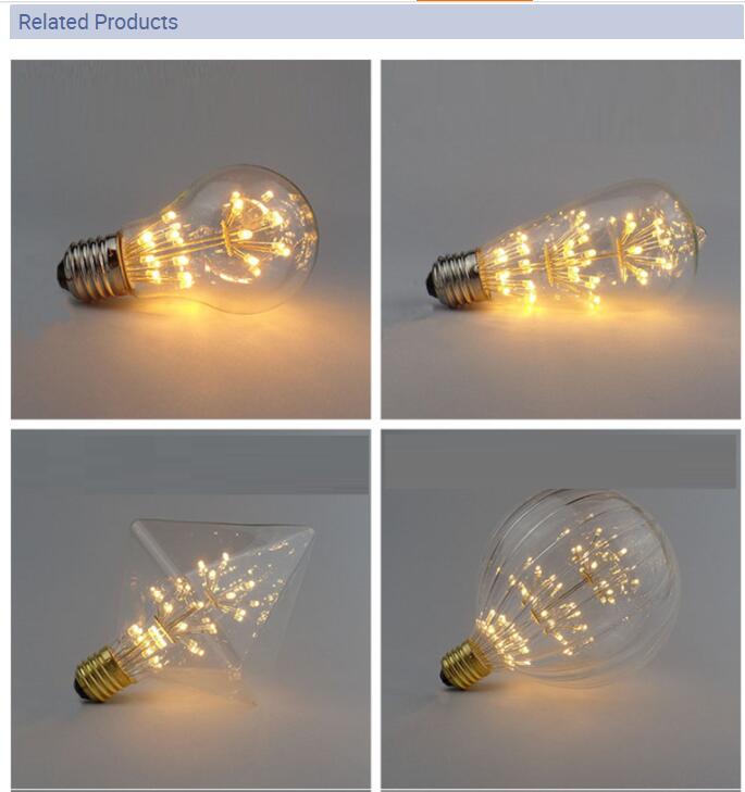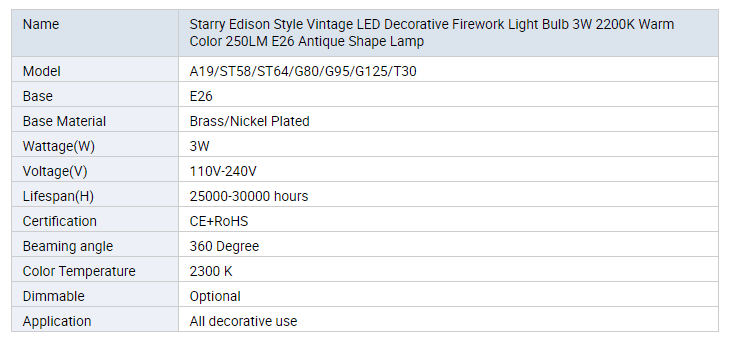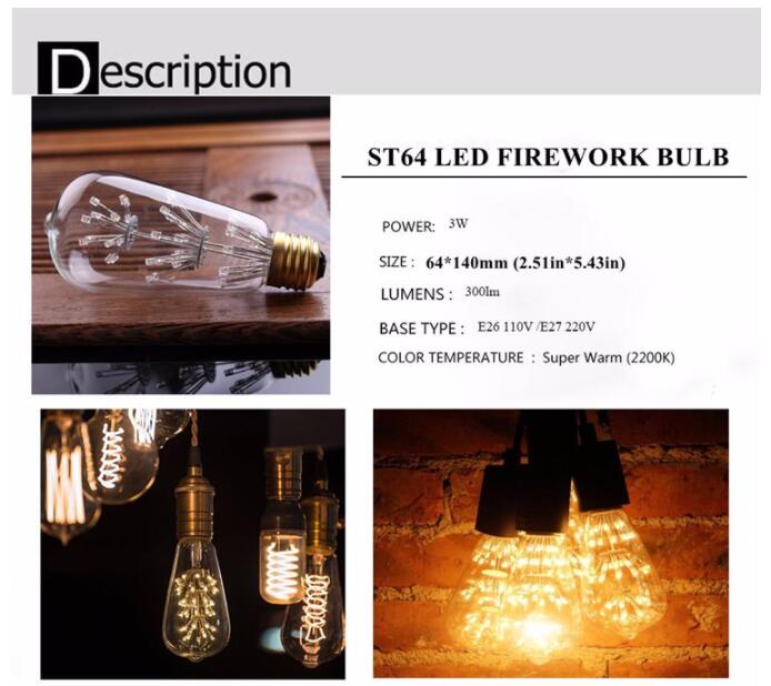 Location: FUZHOU IDAYMAY ELECTRICAL TECHNOLOGY CO.,LTD » LED bulbs » Starry Edison Style Vintage LED Decorative Firework Light Bulb 3W 2200K Warm Color 250LM E26 Antique Shape Lamp